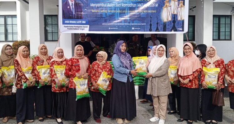 Sekretaris Bapenda Sulteng, Rina Zuryati saat menyerahkan beras gratis kepada salah satu