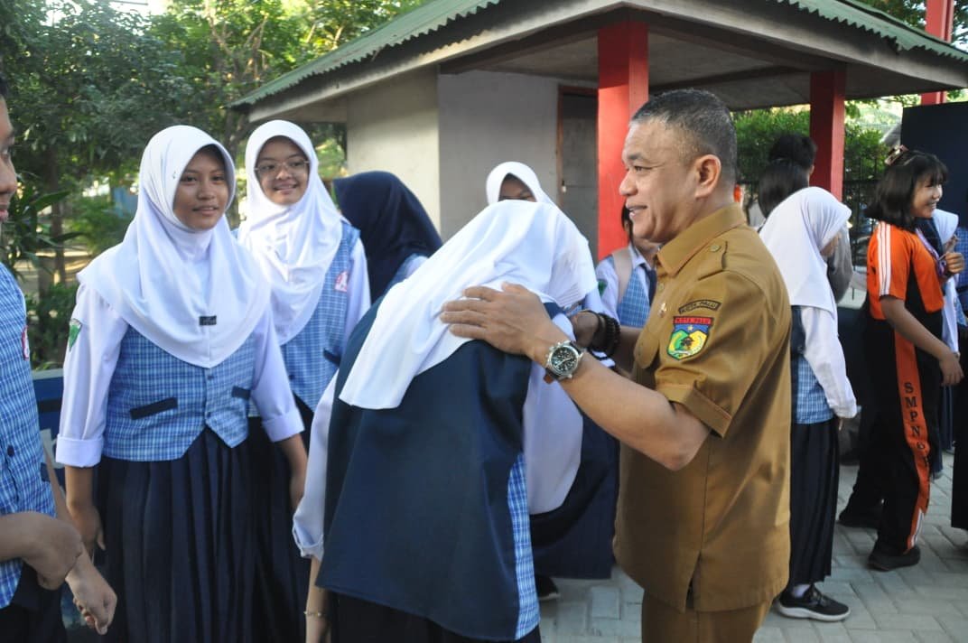Sapa siswa. Walikota Palu,Hadiyanto Rasyid saat berkunjung ke SMPN 6 Palu, meninjau lingkungan sekolah.F-ist